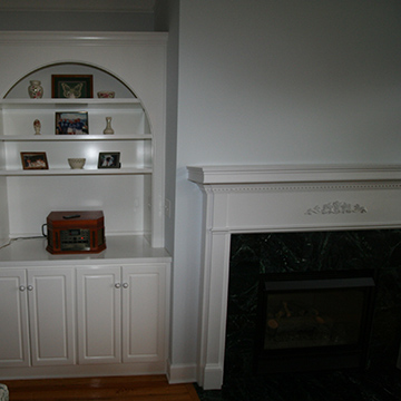 This project came about after we were working on this client’s kitchen; it was actually an additional change order. The original fireplace was a dark green marble tile. Because it was a change order, we didn’t have any before pictures except for a picture that focuses on the bookcase to the left of the fireplace taken for modifications to the shelves, but you can see enough of the fireplace to get an idea. The client was trying to tie the 2 rooms together with the cabinetry details but neither one of us thought about changing the tile originally.  The client was trying to tie the kitchen and living room together, and one of the challenges we faced was whether to remove the existing tile or add new tile over the existing, if it qualified for such. We offered the client two price options and shared the pros and cons of each method. They chose the less expensive overlay method, which I would have done if it were my home because the existing tile was bonded well and left a smooth surface for the new tile and it saved us all from a lot of risk by not having to remove the old tile.  We had enough glass accent tile leftover from the kitchen to add as a feature over the fireplace. My lead carpenter mentioned this to the client and she loved the idea. He did a good job centering the tile layout and creating a picture frame out of oak that matched the surrounding hardwood with a gentle slope created to transition from the height of the tile hearth to the hardwood level.  I think the end result accomplished their goal of tying the living room area to the kitchen, especially now that the tiled fireplace now matched the tile and accent work in the kitchen.