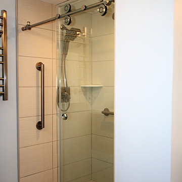 The client’s functional requests included heated floors, heated towel racks, new insulation, sound deadening interior walls, additional storage, and improved lighting. We installed beautiful floating frameless vanities with a tight and structured dark tropical grain that served as a basis for the completed project. Undercabinet lighting illuminates the light “Linen” patterned floor and shower tile from Daltile with its discrete, wavy visual movement that makes the space feel much larger than it is. A simple sandy white quartz countertop with its visual restraint further enhances the space’s Modern Asian appeal.