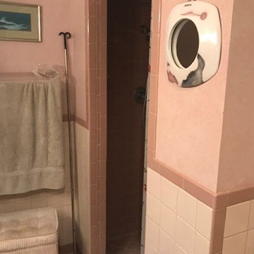 An additional non-plumbed vanity with a linen closet incorporating a clothes hamper replaced a never used 40-year-old Jacuzzi that previously resided in this location. The additional mirror and down lighting associated with this functional improvement furthered the space's perception of being larger than it is.