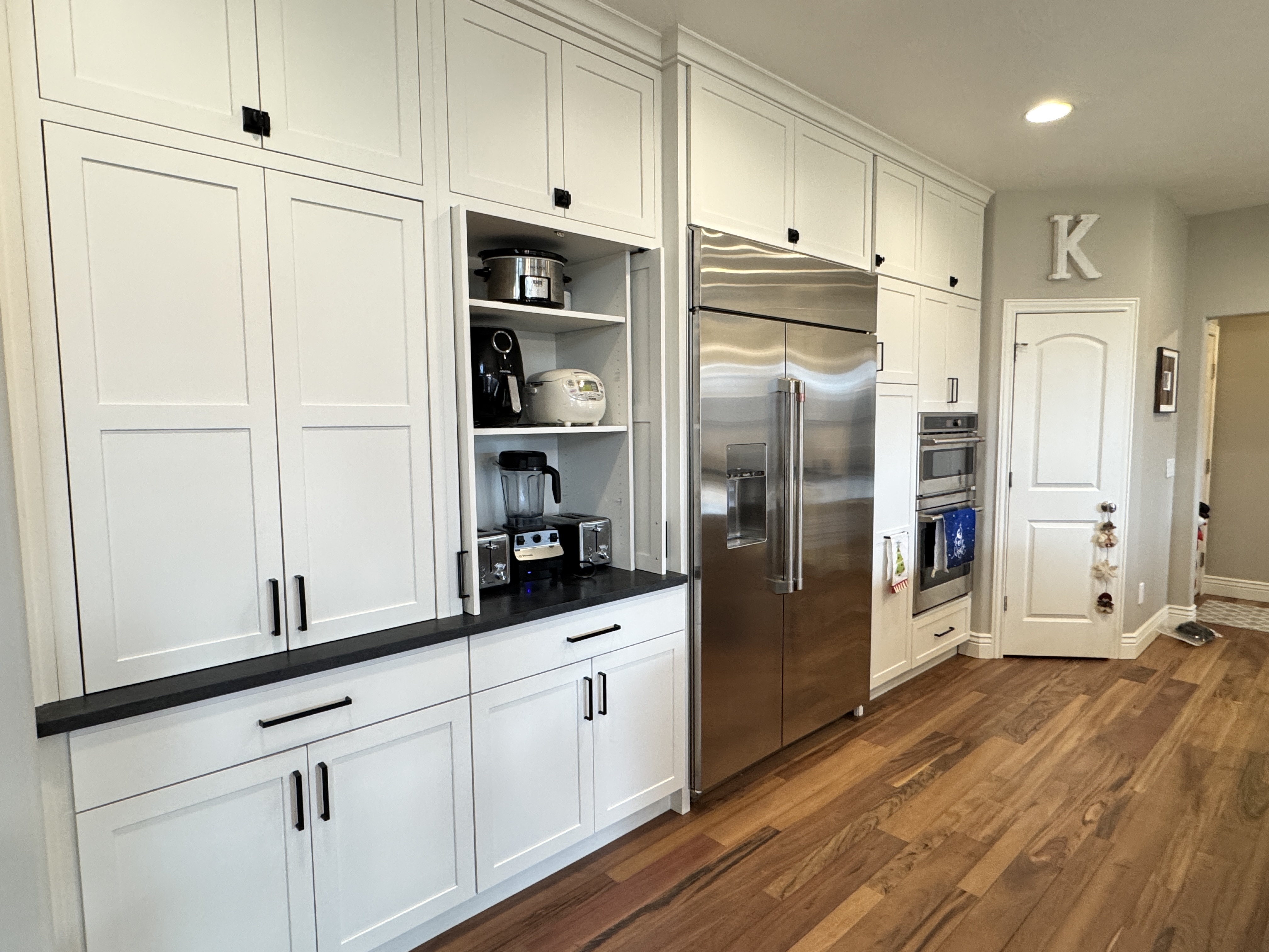 The White Oak cabinets mixed with painted white cabinets are going to create such a bright and open area, especially after removing the wall between the front room and kitchen.