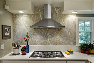 Project Summary Our clients’ 20th floor condo unit boasted magnificent views of a city lake and abundant natural light through large windows. But the light didn’t reach into the kitchen area, and the existing dark and heavy traditional cherry cabinets didn’t help. The existing countertops were higher than standard and too tall for our less-than-five-foot client (she joked that they came up to her chin!) and the different counter levels cut up the counter space, limiting productivity. Our solution for this kitchen remodel combines reworked, refaced, and new cabinets with salvaged and new fixtures and materials to result in a simply elegant light-filled space custom designed to our client.