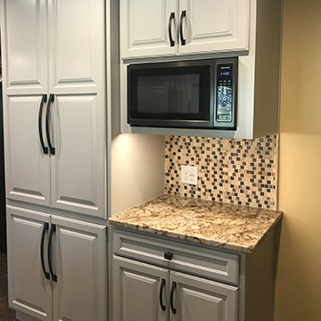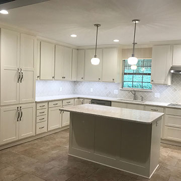 This customer wanted to update their kitchen and make it an open concept, as well as add some functional storage space. The original kitchen had a peninsula, which we removed and added an island for better space utilization. We also added a new super pantry, which greatly increased their storage space. The kitchen received new cabinets, a beautiful backsplash, and fresh paint on the walls and ceiling. For the lights, we installed can lights and pendants over the island and sink, and under counter lights for a softer illumination. The end result is a spectacular and functional new kitchen!