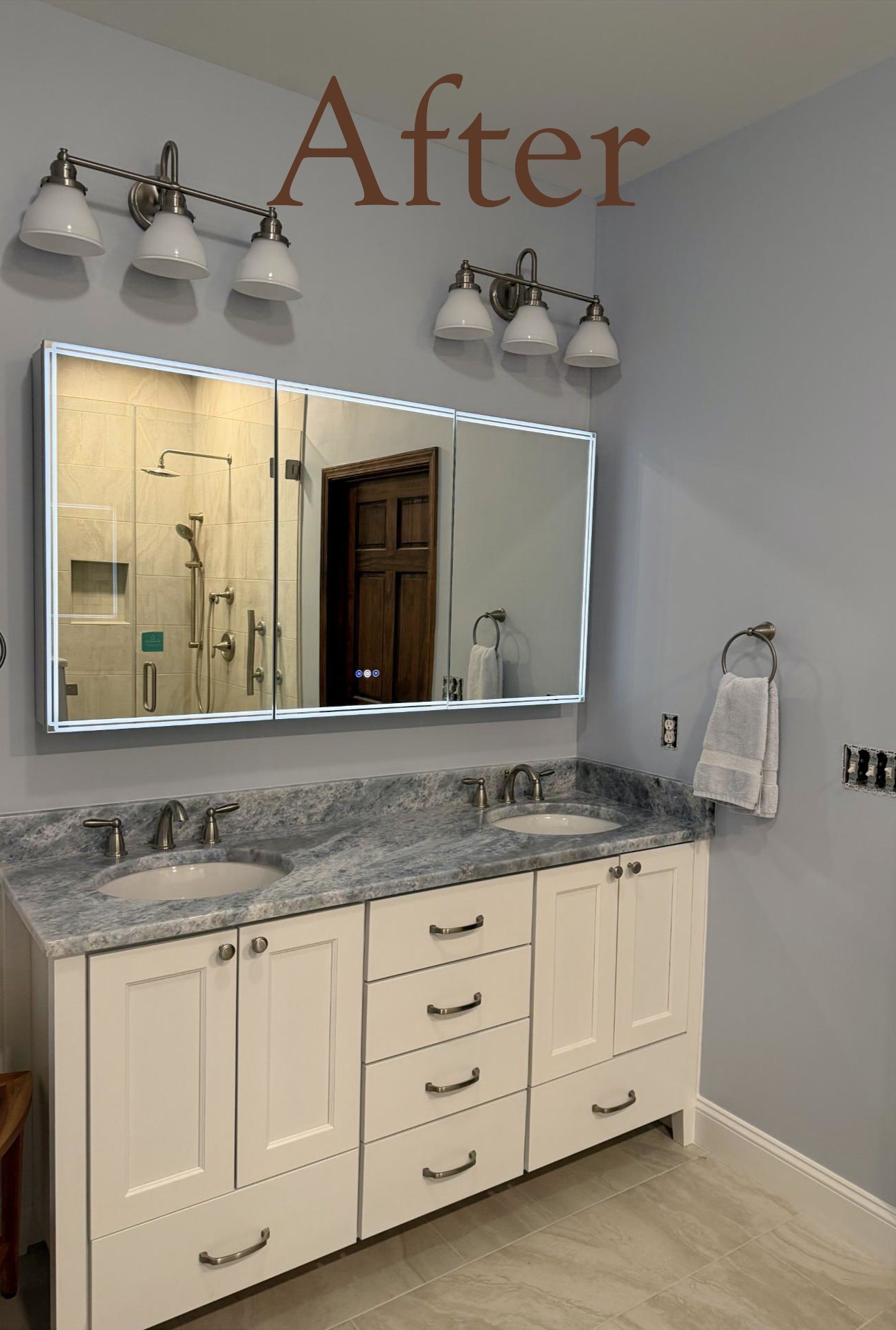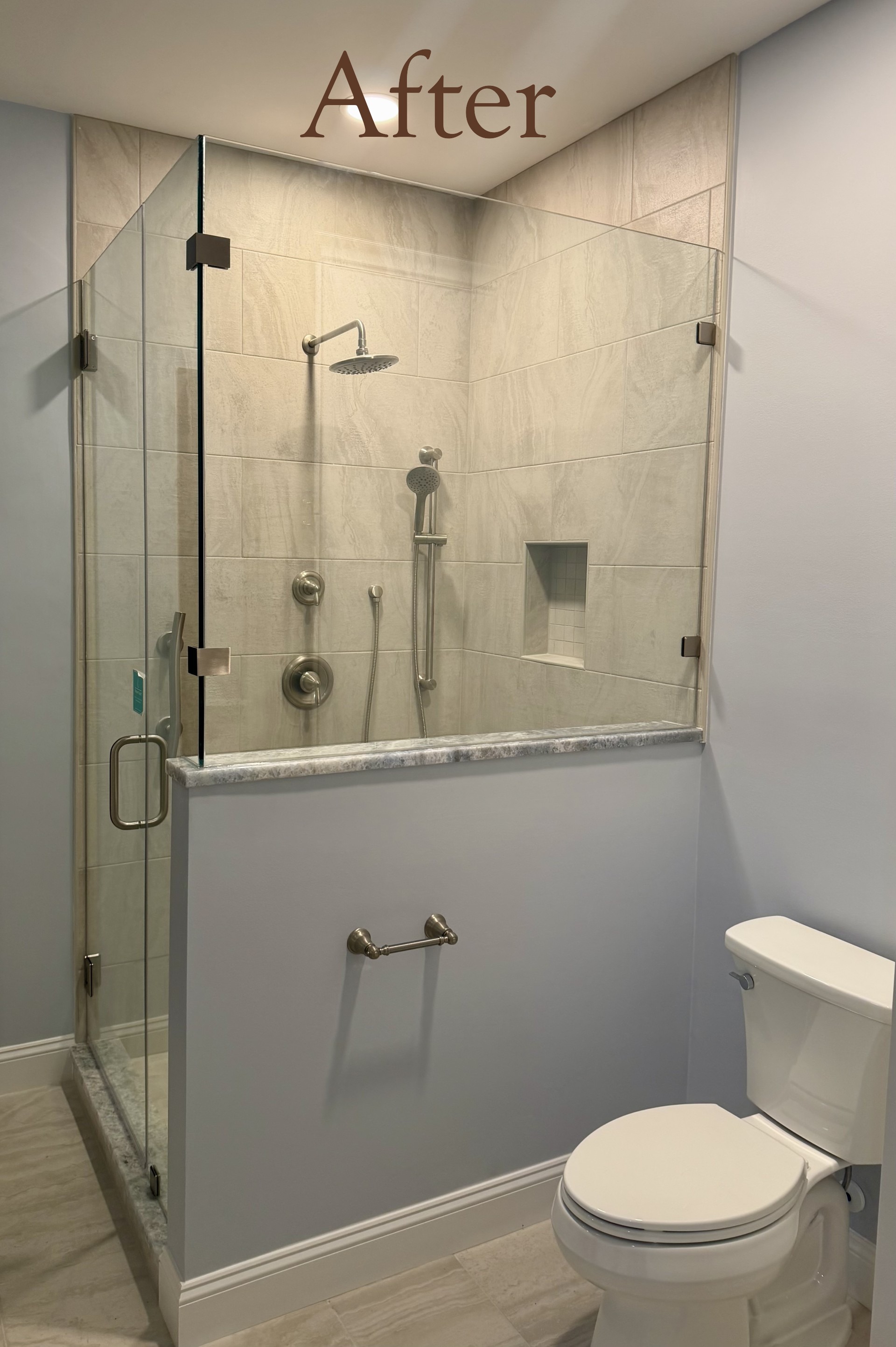 Originally, the shower, toilet, and tub placement limited storage and functionality. Through thoughtful planning and 3D design, we reworked the layout to better support how the homeowners use the space every day.